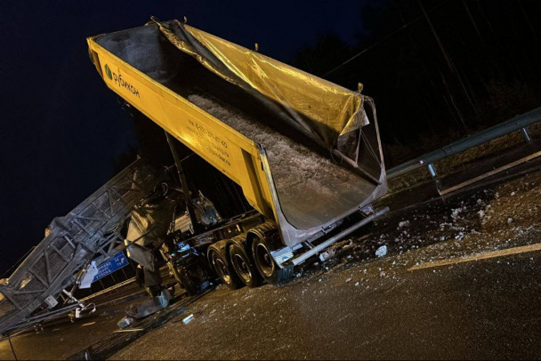 Грузовик с поднятым кузовом снёс рамку и перекрыл движение по «Сортавале» у Лосево