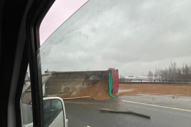 Грузовик с песком опрокинулся на КАД у Новоприозерского шоссе. Собрались пробки