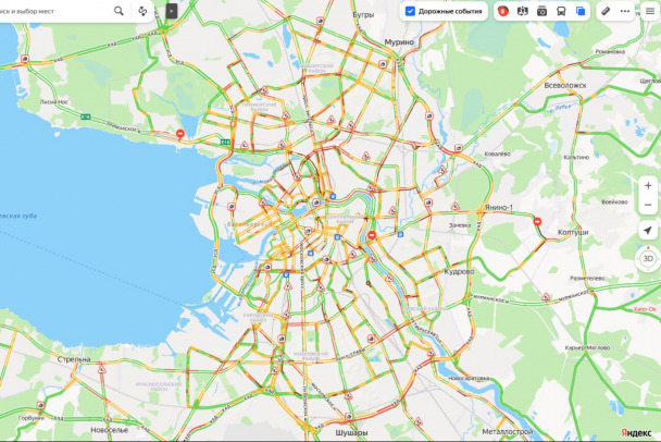 Непогода внесла коррективы, и на дорогах Петербурга уже образовались пробки. Особенно плотно - на кольцевой автодороге.