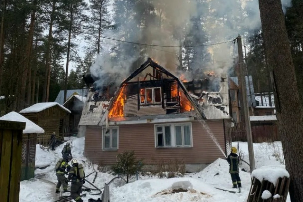 Огонь почти полностью уничтожил одноэтажный дом в Выборгском районе Ленобласти. Людей внутри удалось спасти.